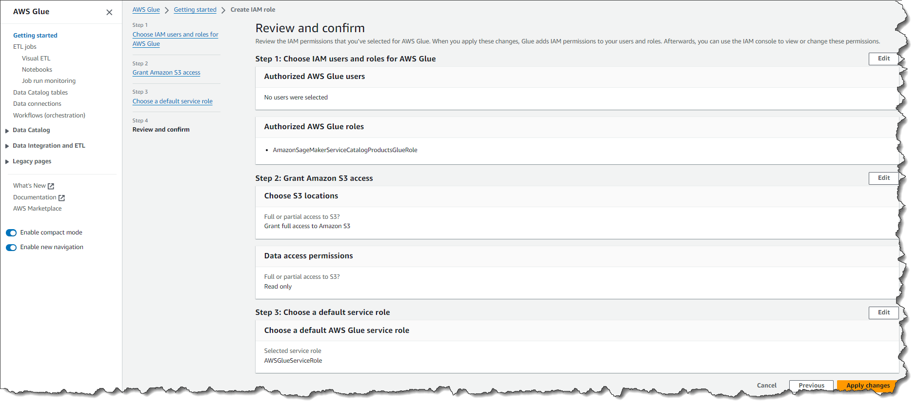This policy grants these users and roles full access to AWS Glue and read access to Amazon Simple Storage Service (Amazon S3) resources.