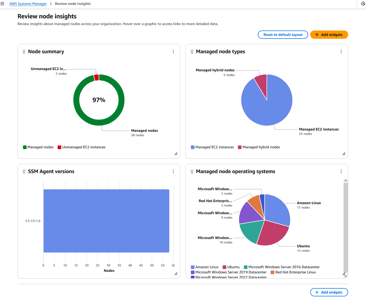Open the menu, and navigate to the Review node insights page. Here you can see a dashboard with widgets that provide insightful interactive charts that you can use to drill down and discover more information about your nodes or even take actions. For example, the Managed node types pie chart shows the types of managed nodes we have whereas the SSM Agent versions graph provides us with an overview of all the different versions of SSM Agent running on them. You can also customize this view by adding and replacing widgets.