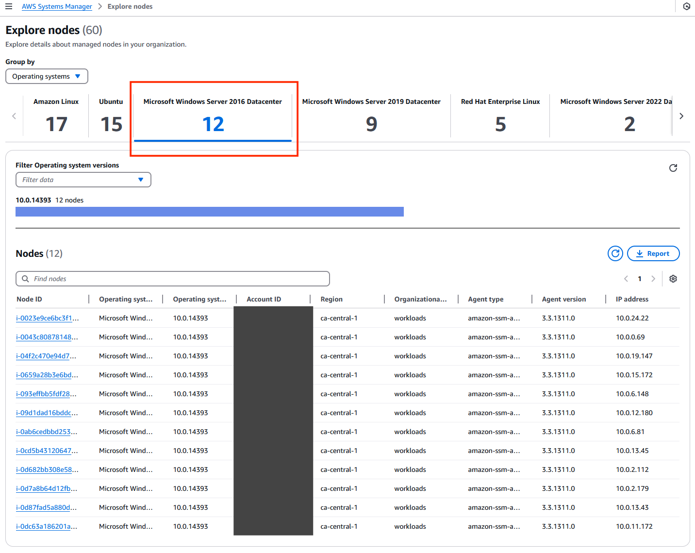 Imagine a scenario where you are a cloud platform engineer leading a migration plan aiming to replace all nodes running Windows Server 2016 Datacenter in the organization. Let’s use the new Systems Manager experience to quickly gather information about all the nodes that needs to be included in our plan.