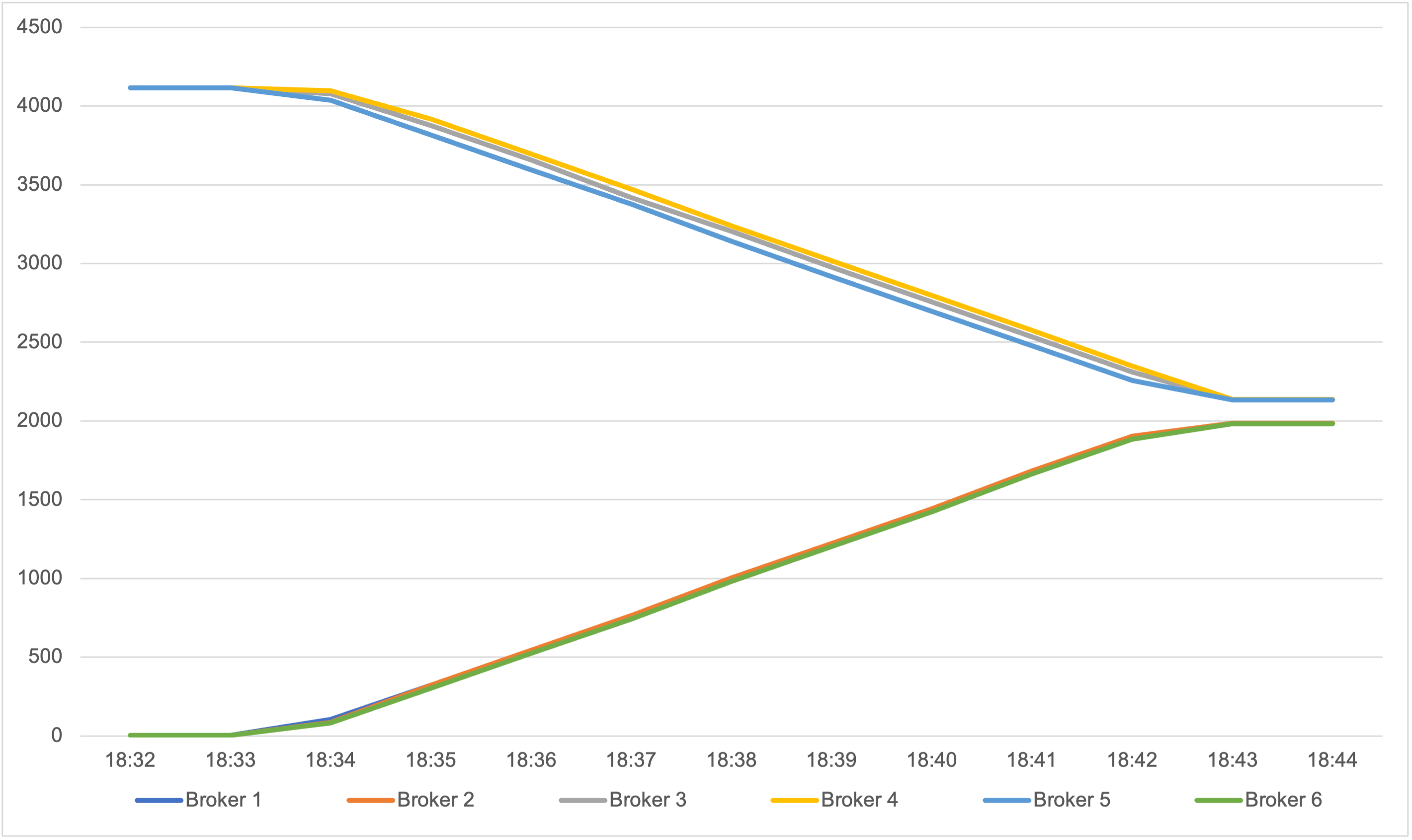 As you can see, it took approximately 10 minutes to reassign these partitions and utilize the additional capacity of the new brokers. When we ran the same experiment on an equivalent cluster comprising of Standard brokers, partition reassignment took over 24hours.