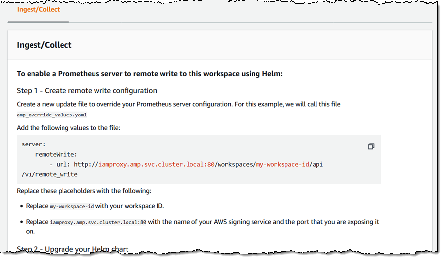 It also provides guidance on how to configure an existing Prometheus server to send metrics to the AMP workspace: