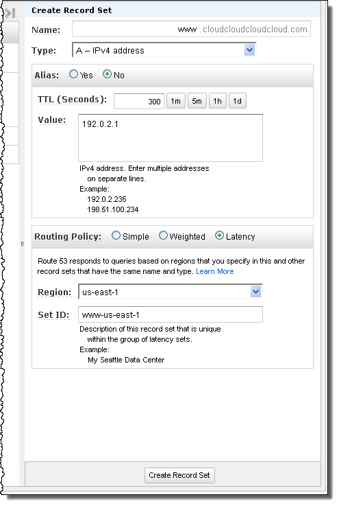 With this kind of configuration, approximately 99% of DNS queries will be unaffected by latency based routing, and users will be directed to the US East (Northern Virginia) answer (192.0.2.1). The other 1% of the time, Route 53 will choose where to send the user based on network latency – some users will be directed to eu-west-1, some to us-east-1 – based on our own global connectivity measurements between the origin of the request and the two AWS regions. Gradually, these percentages can be altered and over time we can transition to a fully latency based decision process.