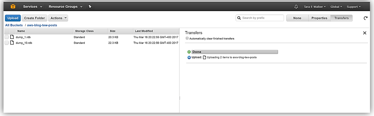 In the S3 console, I will go to my S3 bucket, aws-blog-tew-posts, that I created for testing and development purposes. I’ll upload the .rdb snapshot files that were provided to me into this S3 bucket.