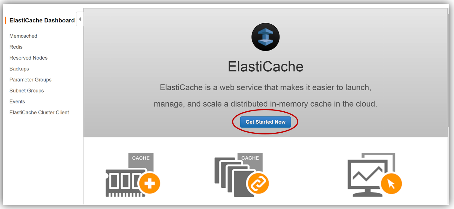 First, I will click the Get Started Now button from the ElastiCache console dashboard or the Create button based upon your console view.
