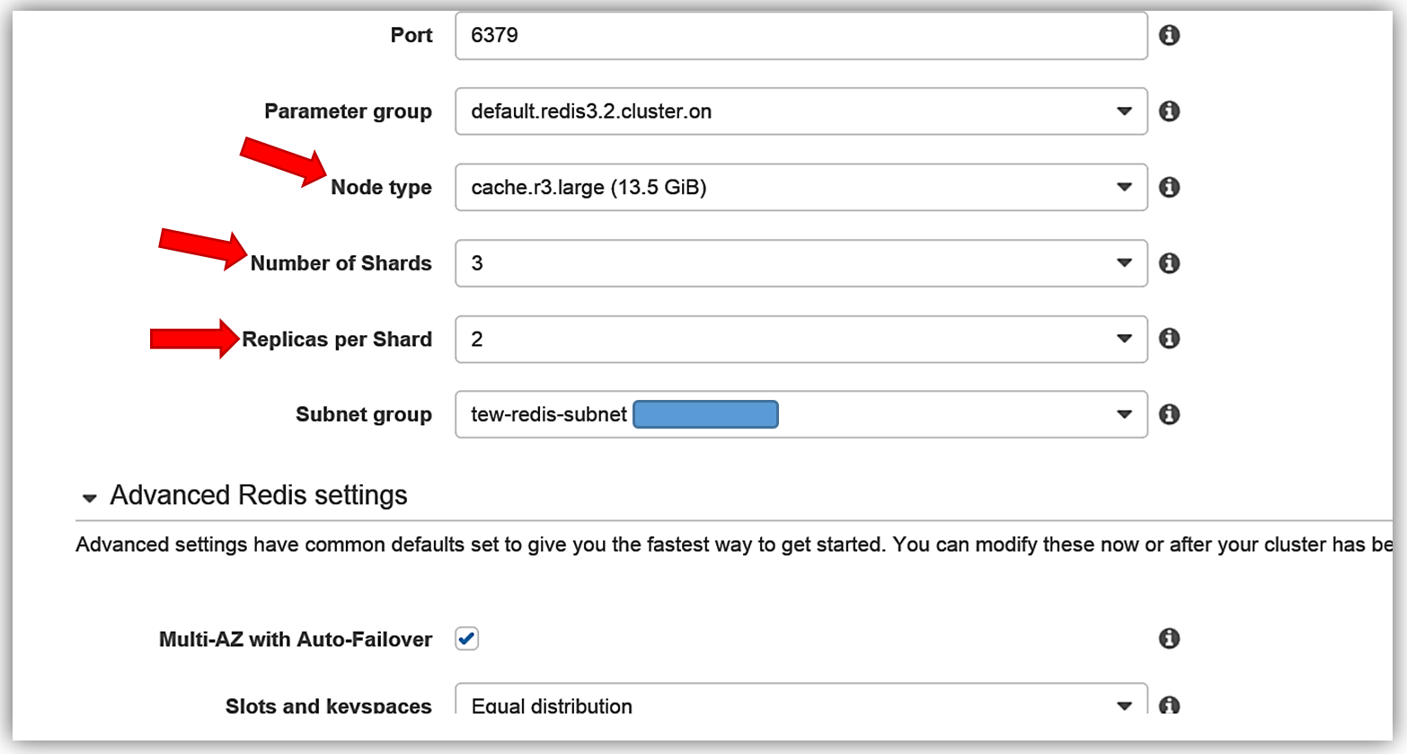 In the Create your Amazon ElastiCache cluster dialog window, I’ll select Redis for my caching and make sure I click the checkbox for Cluster Mode enabled (Scale Out). The name of my new cluster will be, tew-rediscluster and I since I am enabling a Cluster mode, my ElastiCache Redis Engine version is 3.2.4. For this cluster, I will keep the default Redis port of 6379.