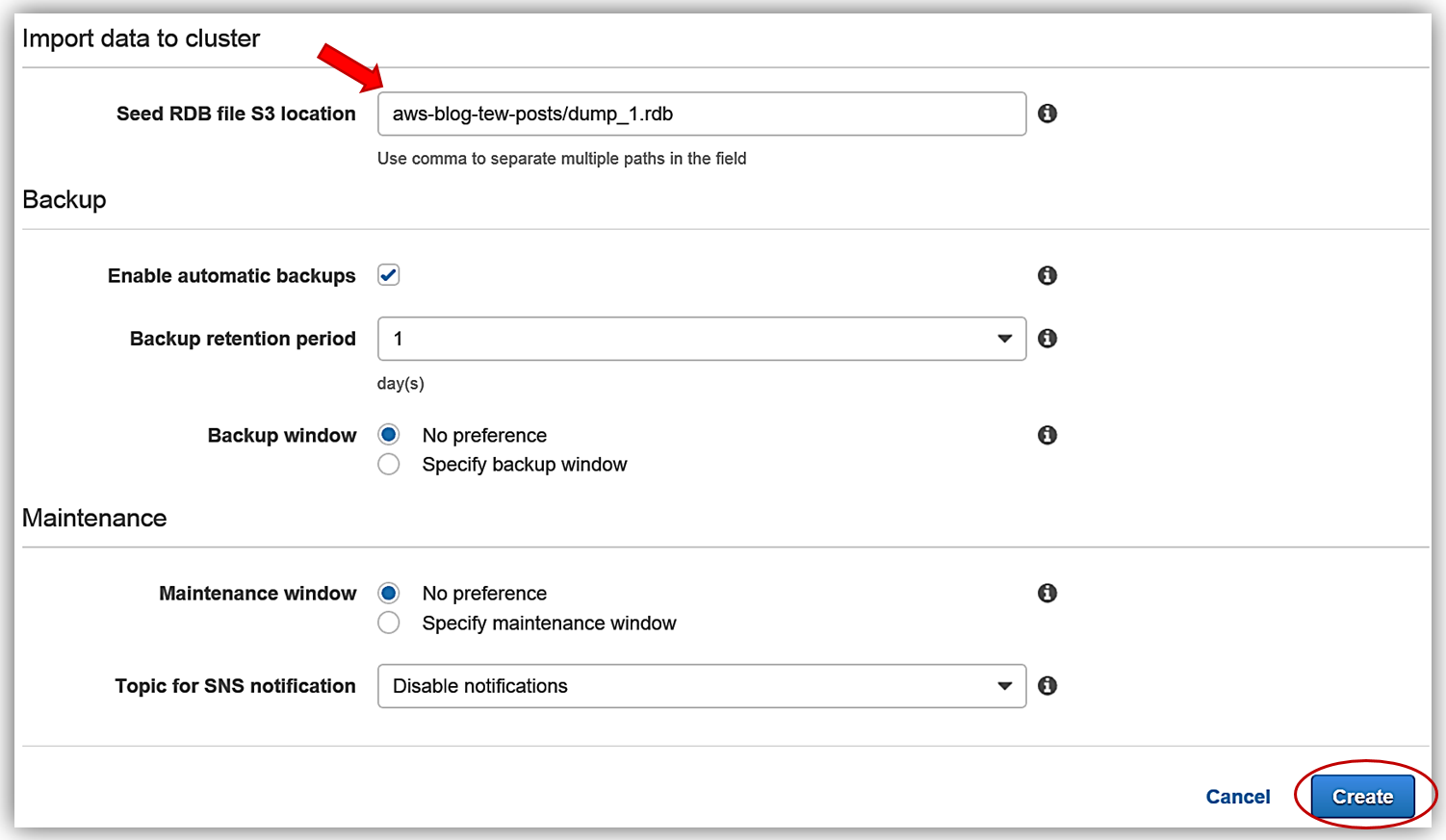 Once I have provided all the information needed to create my ElastiCache Redis cluster, I will need to tell ElastiCache how to seed the cluster with the .rdb file by providing the file location from my S3 bucket. In the Import Data to Cluster section of the create dialog, I will enter the S3 path to my dump_1.rdb in the Seed RDB file S3 location textbox. Remember, the nomenclature for the S3 file path is Bucket/Folder/ObjectName so I will enter aws-blog-tew-posts/dump_1.rdb as the path to the RDB file in S3. All that is left now is to click the Create button.