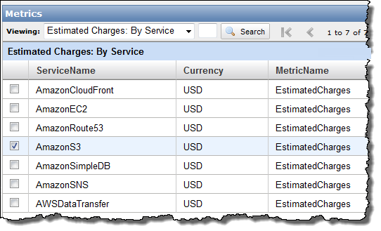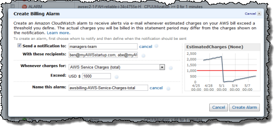 - Establish and monitor ratios between service costs. You can establish a baseline set of costs, and set alarms on the total charges and on the individual services. Perhaps you know that your processing (EC2) cost is generally 1.5x your database (RDS) cost, which in turn is roughly equal to your storage (S3) cost. Once you have established the baselines, you can easily detect changes that could indicate a change in the way that your system is being used (perhaps your newer users are storing, on average, more data than than the original ones).