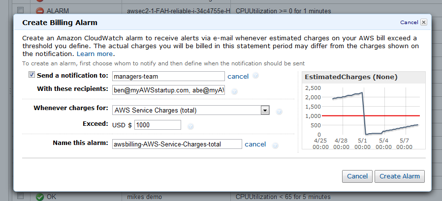 To this end, you can now monitor your estimated AWS charges with our new billing alerts, which use Amazon CloudWatch metrics and alarms.