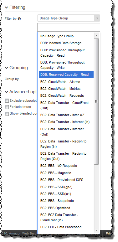 In order to give you even more visibility into your spending, we are introducing some additional filtering options today. You can now filter at a more fine-grained level, zooming in to see costs at the most fundamental, as-metered units. You can also zoom out, categorizing your usage at a high level that is nicely aligned with the primary components of AWS usage and billing.