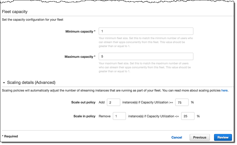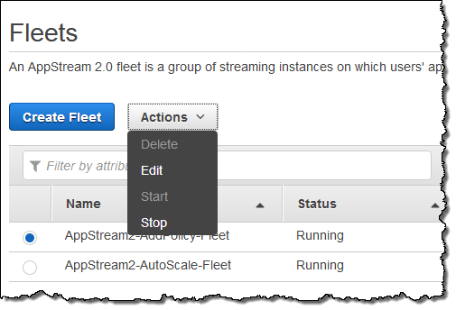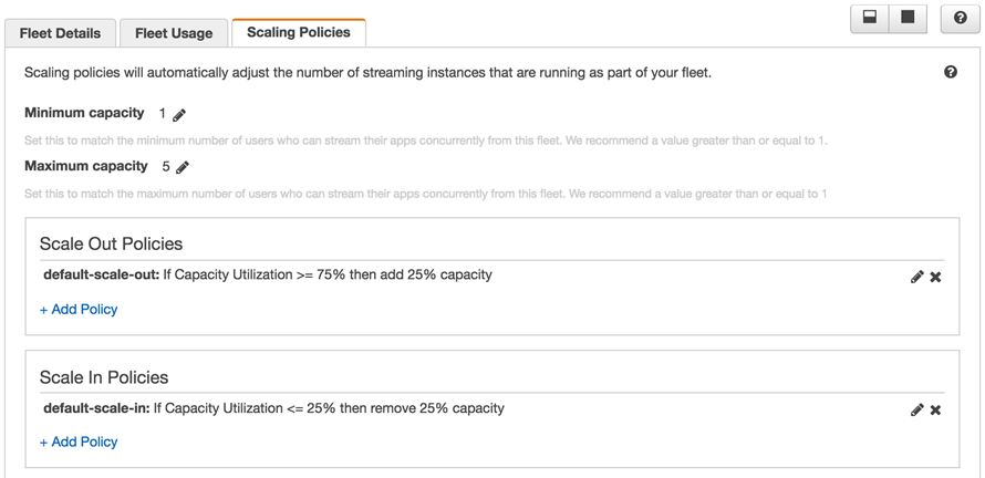 This will create the default policies, which you can later edit, add, or remove (you can have up to 50 policies per fleet). To learn more, read about AppStream Fleet Auto Scaling.