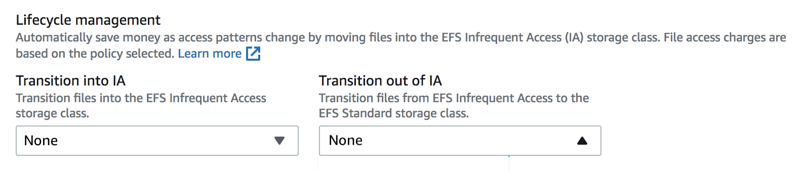 Choose a Transition into IA option to move infrequently accessed files to the IA storage classes. From the drop down list, you can choose lifecycle policies of 7, 14, 30, 60, or 90 days. Additionally, choose a Transition out of IA option and select On first access to move files back to EFS Standard or EFS One Zone storage classes on access.