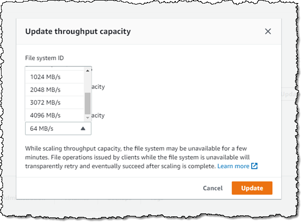 Changes take effect within minutes. The file system remains active and mounted while the change is put into effect, but some operations may pause momentarily: