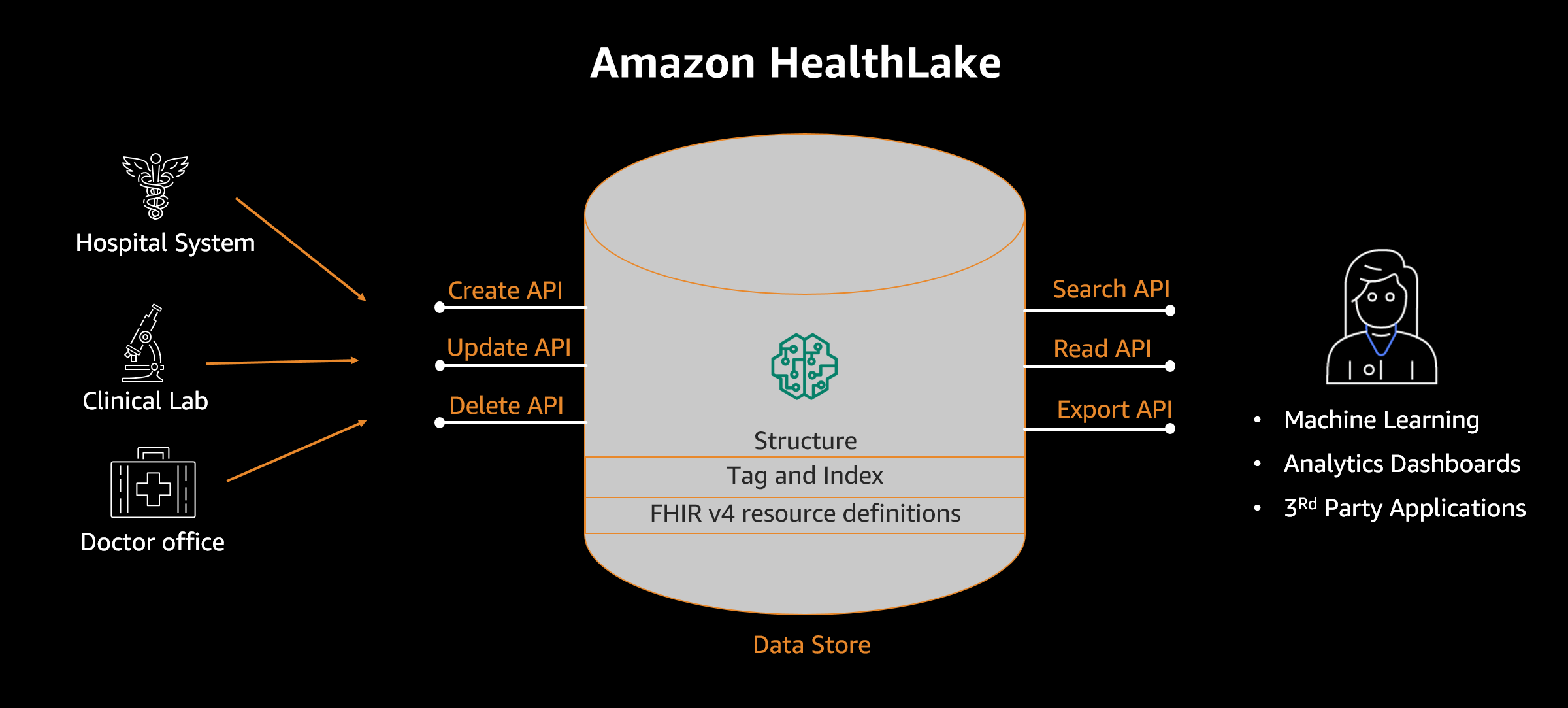 From the AWS Management Console, healthcare organizations can use the HealthLake API to copy their on-premises healthcare data to a secure data lake in AWS with just a few clicks. If your source system is not configured to send data in FHIR format, you can use a list of AWS partners to easily connect and convert your legacy healthcare data format to FHIR.