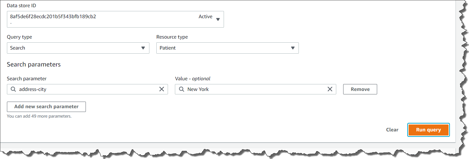 Once your Data Store is created, you can perform a Search, Create, Read, Update or Delete FHIR Query Operation. For example, if you need a list of every patient located in New York, your query setting looks like the screenshots below. As per the FHIR specification, deleted data is only hidden from analysis and results; it is not deleted from the service, only versioned.