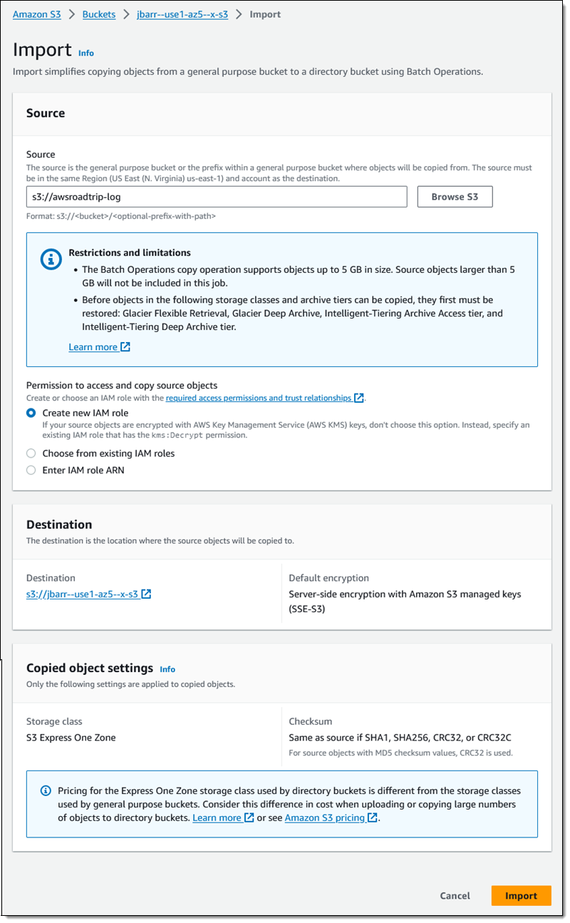 I can import the contents of an existing bucket (or a prefixed subset of the contents) into a directory bucket using the Import button, as seen above. I select a source bucket, click Import, and enter the parameters that will be used to generate an inventory of the source bucket and to create and an S3 Batch Operations job.