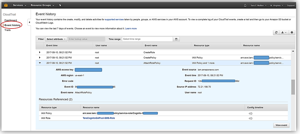 With CloudTrail being enabled by default, all AWS customers can now log into CloudTrail and review their Event History. In this view, not only do you see the last seven days of events, but you can also select an event to view more information about it.