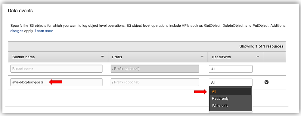Next step is for me to select the S3 buckets for which I desire to track the S3 object-level operations. This is an optional step, but note that by default trails do not log Data Events. Therefore, if you want to track the S3 object event activity you can configure your trail to track Data Events for objects in the bucket you specify in the Data events section. I’ll select my aws-blog-tew-posts S3 bucket, and keep the default option to track all Read/Write operations.