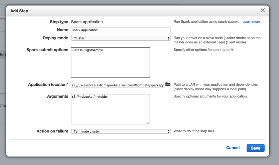 In the modal, select Cluster for Deploy Mode. For Application location, enter s3://us-east-1.elasticmapreduce.samples/flightdata/sparkapp/flightsample-1.0.jar. For Arguments, add an S3 path to a bucket in your account where you would like Spark to write the output. And, change Action on failure to Terminate cluster. Then click Add.
