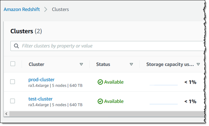 I don’t happen to have a data warehouse! I used a snapshot provided by the Redshift team to create a pair of clusters. The first one (prod-cluster) does not have AQUA enabled, and the second one (test-cluster) does: