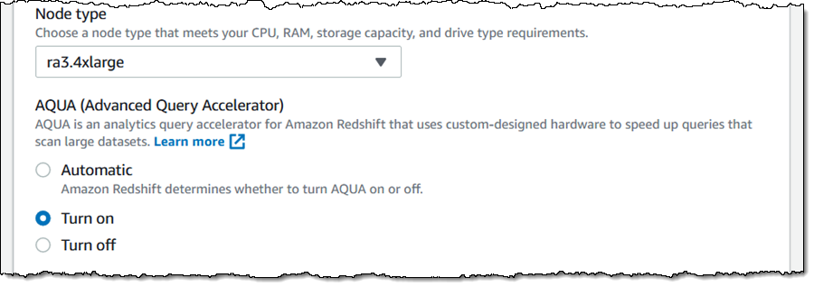 To create the AQUA-enabled cluster, I simply choose Turn on on the Cluster configuration page: