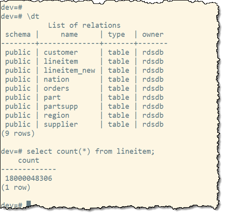 My queries will use the lineitem table, which has over 18 billion rows: