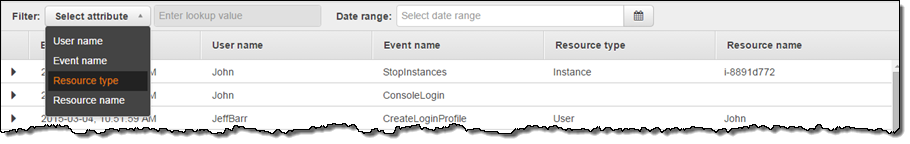 As I mentioned, you can use this feature to troubleshoot operational issues in your AWS account. For example, I saw that one of my EC2 instances in my web server fleet was not responding, so I navigated to the CloudTrail console and filtered the API activity by resource type EC2 Instance. I found that one of my team members (John) stopped the instance and was able to establish the root cause: