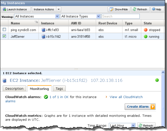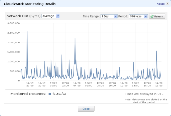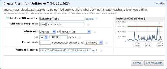 Let’s say I want to know when the Network Out traffic for my JeffServer instance exceeds 1.5 Megabytes within a 5 minute period (this instance hosts personal blogs for me and several members of my family, along with some other random web sites, none of which see a whole lot of traffic). I chose this number after inspecting the detailed graph for this metric on this instance:
