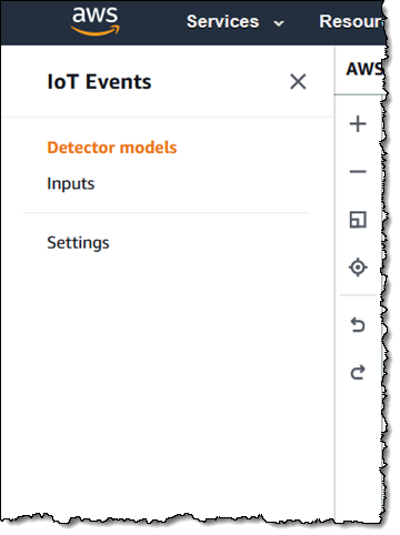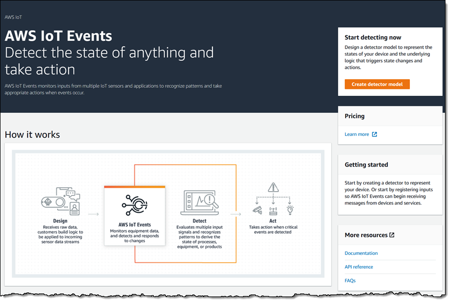 You can access AWS IoT Events from the AWS IoT Event Console or by writing code that calls the AWS IoT Events API functions. I’ll use the Console, and I will start by creating a detector model. I click Create detector model to begin: