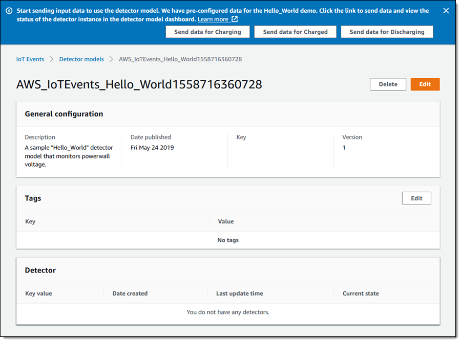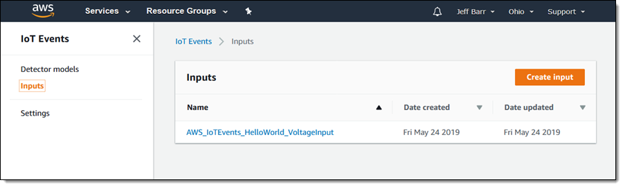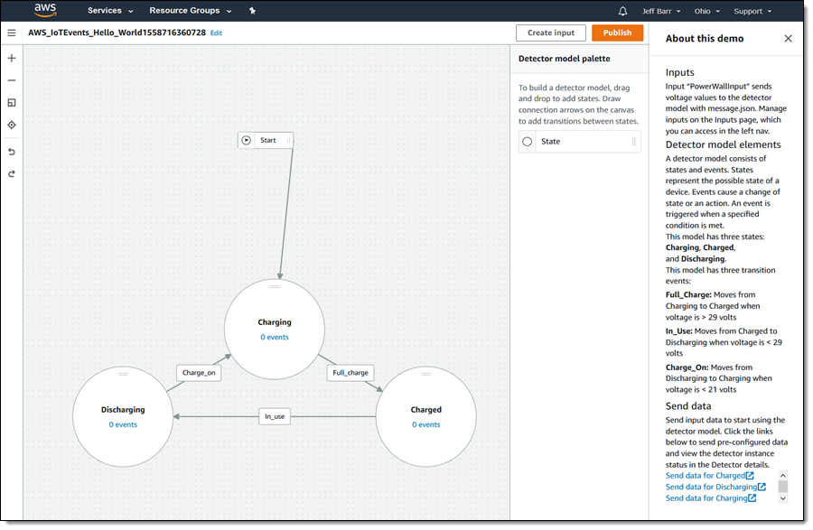 As you will see in a moment, you can easily create detector models that represent your devices, their states, and the transitions (driven by sensors and events, both known as inputs) between the states. The models can trigger actions when critical events are detected, allowing you to build robust, highly automated systems. Actions can, for example, send a text message to a service technician or invoke an AWS Lambda function.