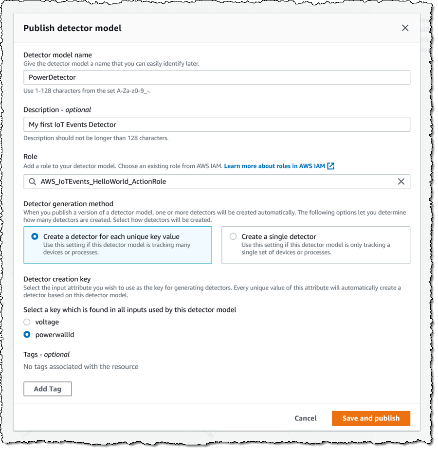 After I create my inputs and my detector, I Publish the model so that my IoT devices can use and benefit from it. I click Publish and fill in a few details: