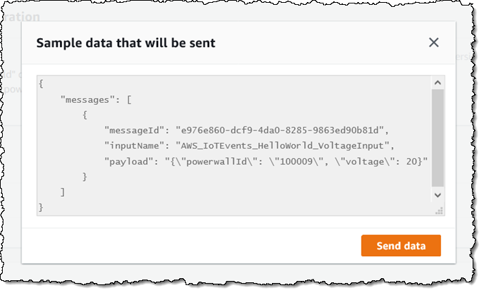 There are three Send options at the top; each one sends data (an input) to the detector model. I click on Send data for Charging to get started. This generates a message that looks like this; I click Send data to do just that: