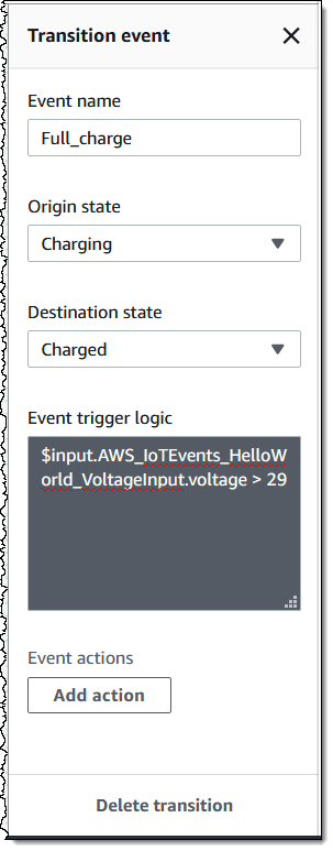The trigger logic is evaluated each time an input is received (your IoT app must call BatchPutMessage to inform AWS IoT Events). If the trigger logic evaluates to a true condition, the model transitions to the new (destination) state, and it can also initiate an event action. This transition has no actions; I can add one (or more) by clicking Add action. My choices are: