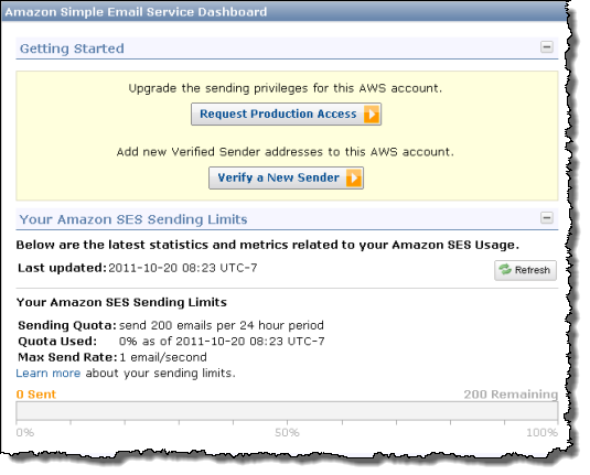 The Dashboard allows you to request production access so that you can send email to unverified addresses. You can verify addresses during your testing phase, and you can also view your statistics and limits: