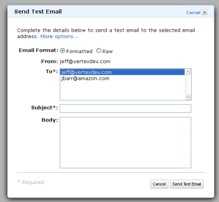 You can now access Amazon SES through the AWS Management Console. The new SES tab provides you with access to all of the important features of SES (you’ll still need to call the Amazon SES API to send your production emails). You don’t have to install and configure the Amazon SES command line tools anymore.