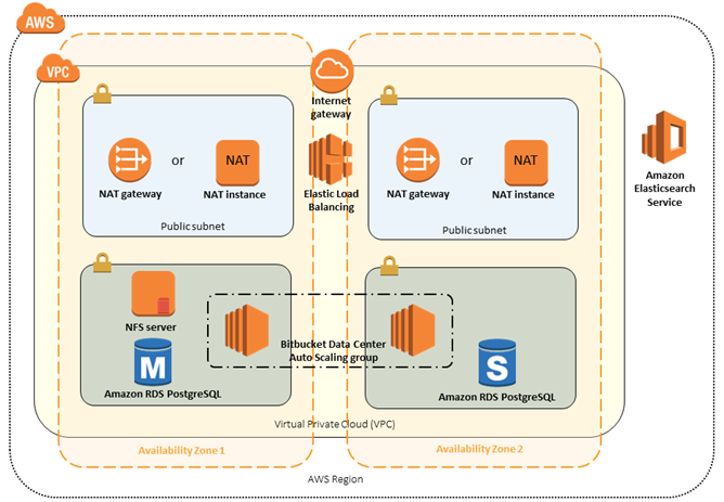 The Quick Starts include AWS CloudFormation templates that allow you deploy Bitbucket and/or JIRA Software into a new or existing Virtual Private Cloud (VPC). If you want to use a new VPC, the template will create it, along with public and private subnets and a NAT Gateway to allow EC2 instances in the private subnet to connect to the Internet (in regions where the NAT Gateway is not available, the template will create a NAT instance instead). If you are already using AWS and have a suitable VPC, you can deploy JIRA Software Data Center and Bitbucket Data Center there instead.