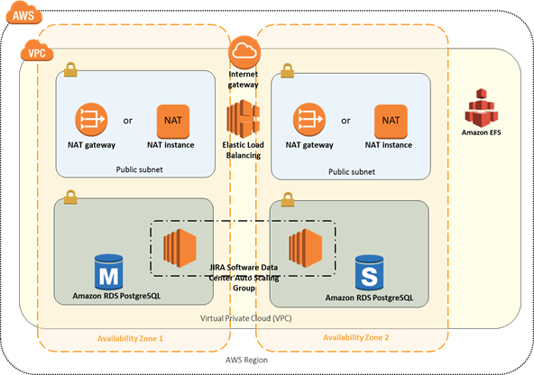 Amazon RDS PostgreSQL – JIRA Data Center requires a supported external database. Amazon RDS for PostgreSQL in a Multi-AZ configuration allows failover in the event the master node fails.