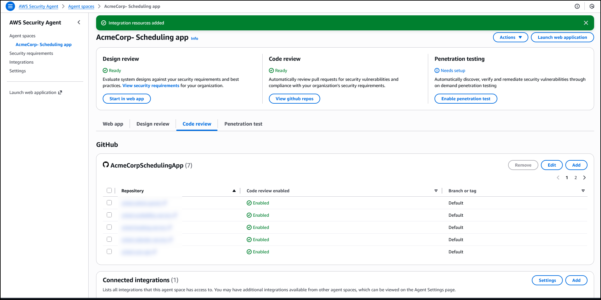 To enable code review, choose Enable code review on the agent configuration page and connect your GitHub repositories. You can enable code review for specific repositories or connect repositories without enabling code review if you want to use them for penetration testing context instead.