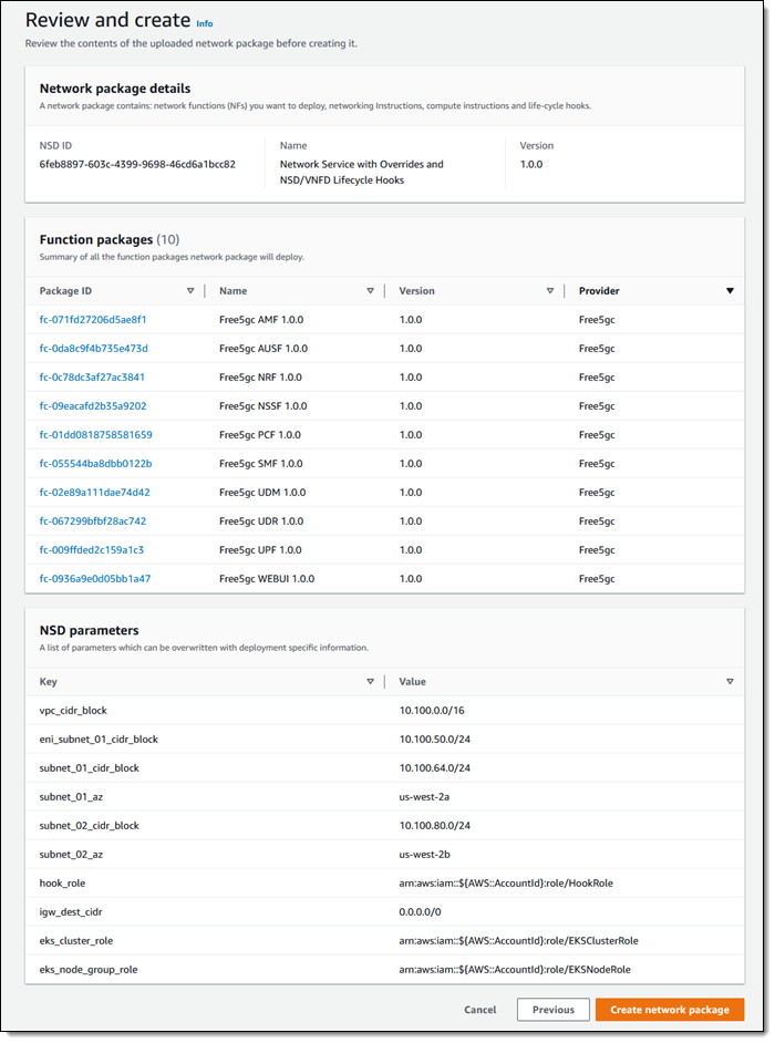 I click Create network package, select the NSD, and click Next to proceed. AWS TNB asks me to review the list of function packages and the NSD parameters. I do so, and click Create network package: