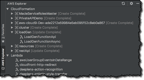 The AWS Explorer shows Lambda functions and AWS CloudFormation stacks in the selected AWS region. Starting from a CloudFormation stack, you can see which Lambda functions are part of it.