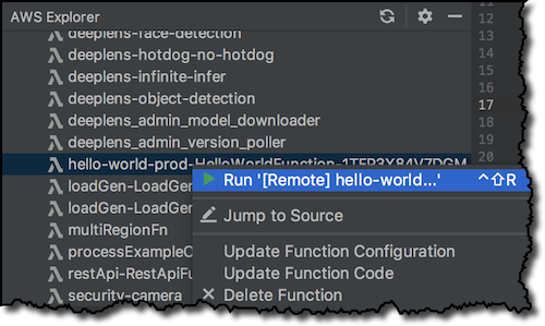 After a few minutes, the stack creation is complete and I can run the function in the cloud with a right-click in the AWS Explorer. Here there is also the option to jump to the source code of the function.