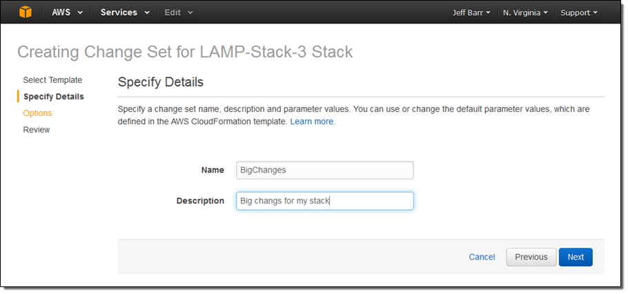 As I mentioned earlier, many AWS customers use CloudFormation to manage updates to their production stacks. They edit their existing template (or create a new one) and then use CloudFormation’s Update Stack operation to activate the changes.