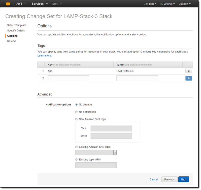 At this point I had the option to modify the existing tags and to add new ones. I also had the option to set up advanced options for the stack (none of these will apply until I actually execute the change set, of course):