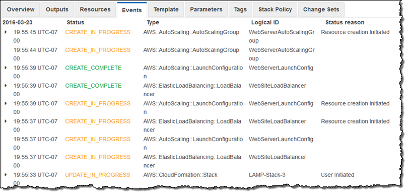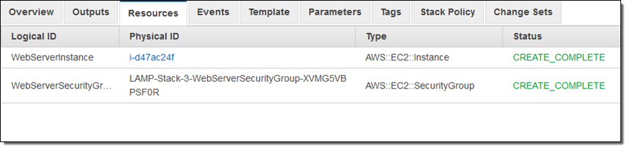 I started by creating a stack that runs a LAMP stack on a single EC2 instance. Here are the resources that it created: