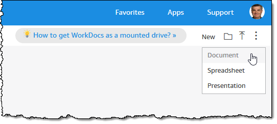 I start by creating a document, spreadsheet, or presentation using the New menu. I’ll create a document: