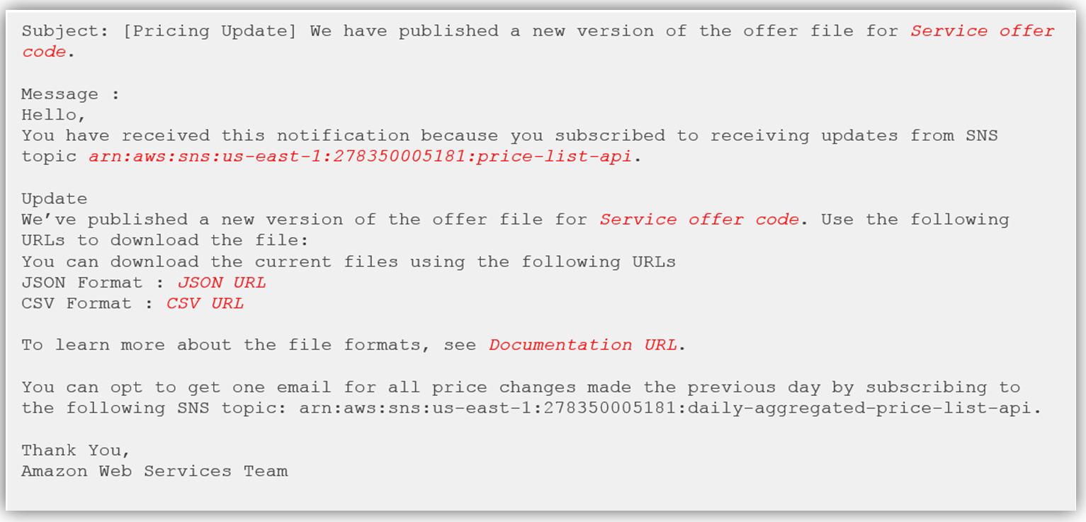 In addition to the expansion of the AWS Price List API, customers can sign up to receive notification around price cuts, new services and instance types. Upon subscribing to receive notifications, you can customize the timing of the receipt of the updates to be once a day or every time a price update occurs. If you choose to be notified once a day, the SNS notification will include all price changes applied during that day. Here’s a sample of an email notification that would be received upon subscribing to the price list API: