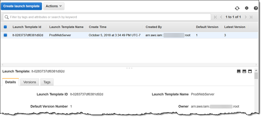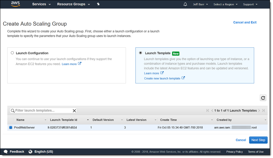 I can create an Auto Scaling Group from the EC2 Console, CLI, or API. The first step is to make sure that I have a suitable Launch Template (it should not specify the use of Spot Instances). Here’s mine: