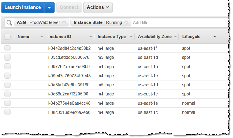 I can filter by tag in the EC2 Console and display the Lifecycle column to see the mix of On-Demand and Spot Instances: