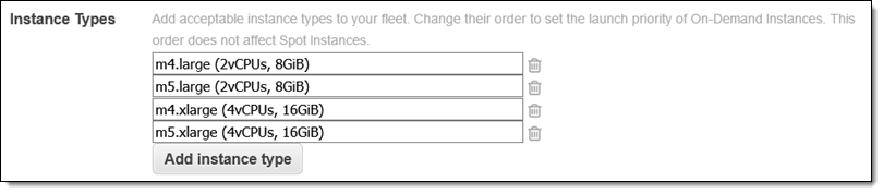Now I select the instance types that I want to use. The list is prioritized: instances at the top of the list will be used in preference to those lower down when On-Demand instances are launched. My app will run fine on M4 or M5 instances with 2 or more vCPUs: