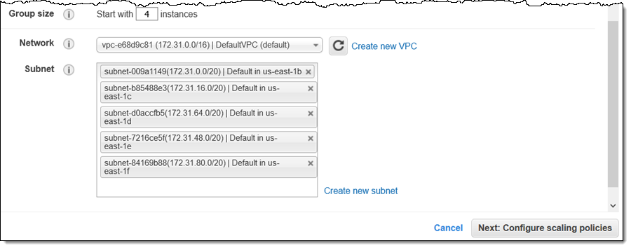 As you can see, I have full control over how my group is built. I leave them all as-is, set my group to start with 4 instances, choose my VPC subnets, and click Next to set up my scaling policies, as usual: