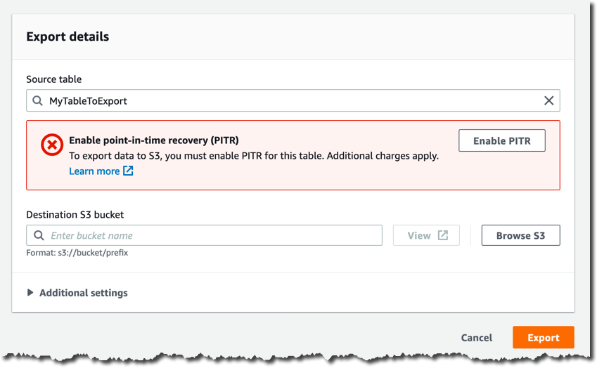 Because data is exported to your own S3 bucket and continuous backups are a prerequisite of the export process, remember that you’ll incur additional costs related to DynamoDB PITR backups and Amazon S3 data storage. All the cost components involved only depend on the amount of data you’re exporting. So the overall cost is easy to estimate, and much lower than the total cost of ownership of building custom solutions with high-read throughput and expensive maintenance.